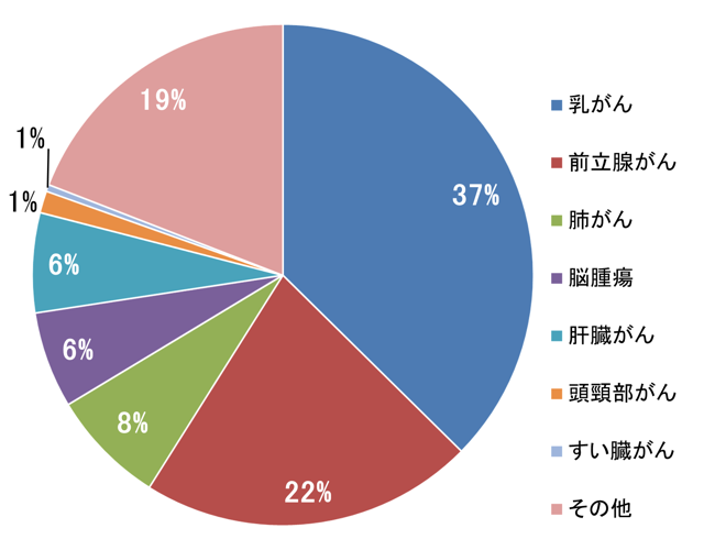 【乳がん37%、前立腺がん22%、肺がん8%、脳腫瘍6%、肝臓がん6%】