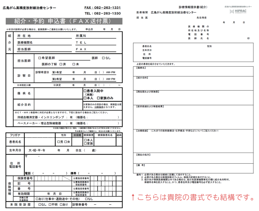 - 下記の【紹介・予約申込書】【診療情報提供書】に必要事項を記入し、FAXでお送りください。【診療情報提供書】につきましては、貴院でお使いの書式でも結構です。